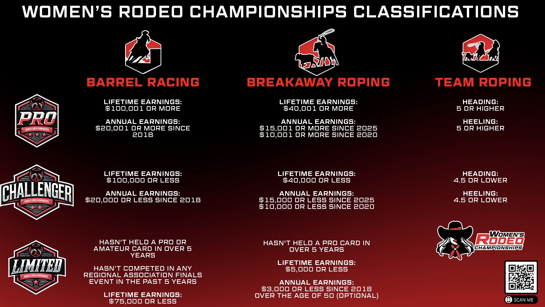 Limited classification targets athletes not yet Pros or Challengers, providing competition at Premier Women’s Rodeo. It includes Breakaway Roping and Barrel Racing (No Team Roping). Limited athletes cannot compete on Pro or Challenger leaderboards in Barrel Racing or Breakaway Roping.