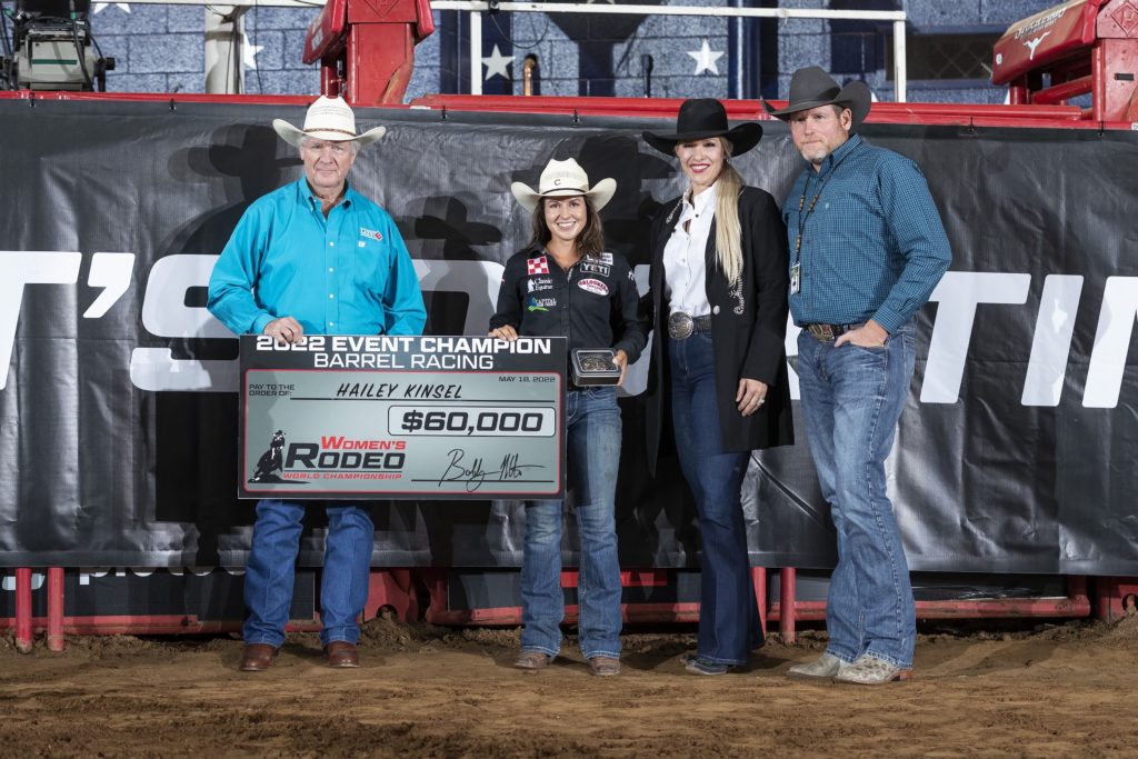 “What a race!” said an out-of-breath but beaming Kinsel, who ran back into the arena on her own two feet for an in-arena interview that will air June 5 with the rest of the Triple Crown of Rodeo Round presented by the Lazy E Arena on CBS Sports Network.