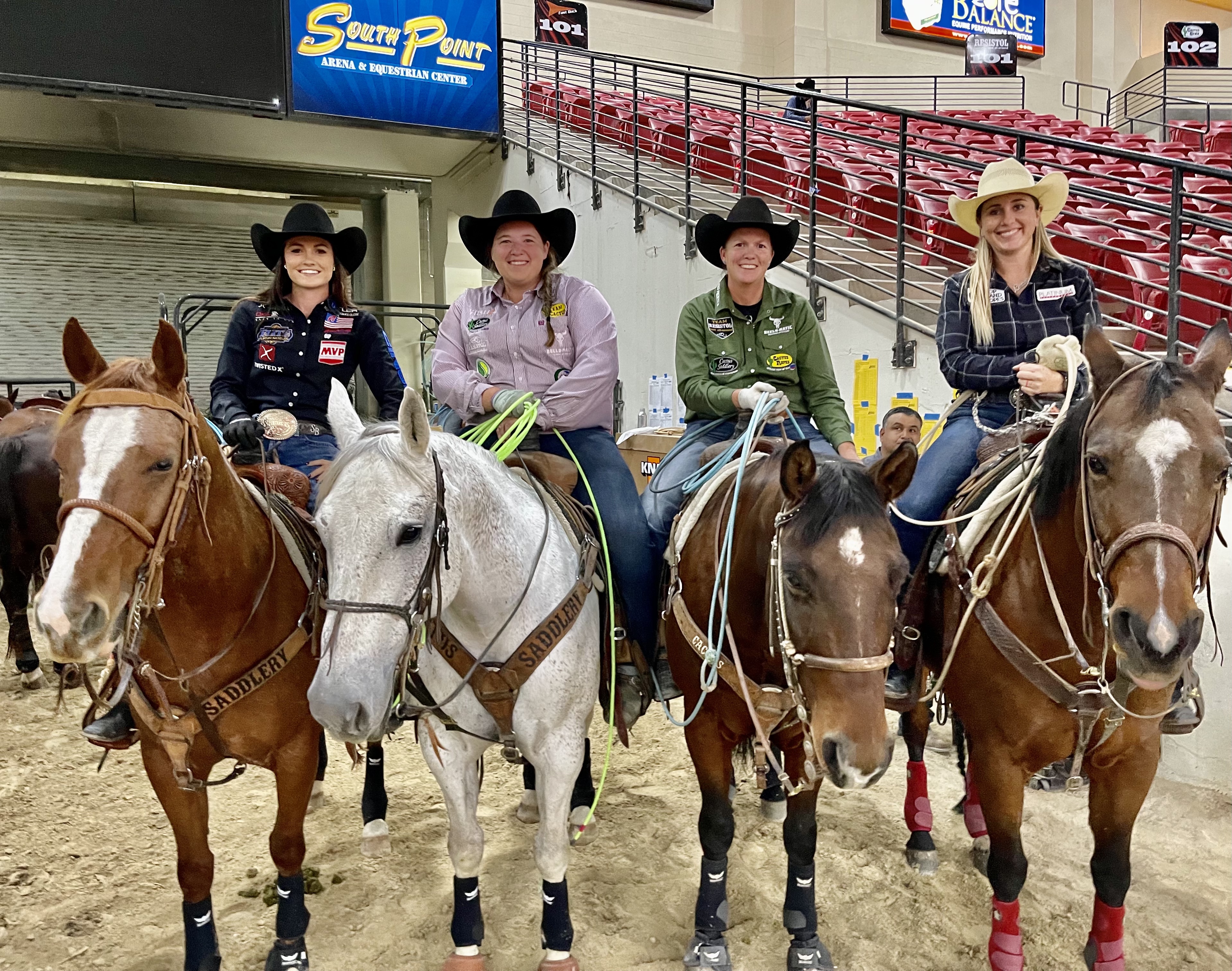 Switch enders at the 2021 WRWC at the South Point include Shelby Boisjoli, Whitney DeSalvo, Kim Grubbs and Bailey Kretschmer, who’s the little sister of three-time World Champion Heeler Jade Corkill. Kendra Santos Photo
