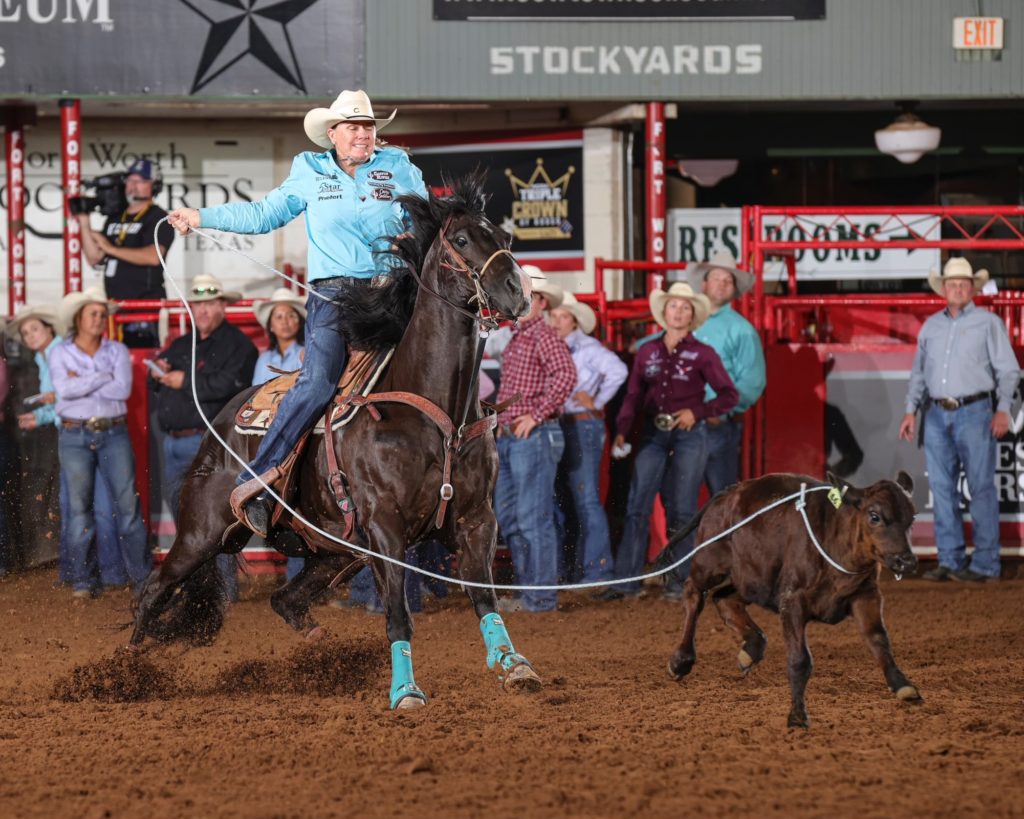 Guy’s in Cowtown from her home in Abilene, Texas, competing as one of 23 breakaway roping professionals vying for the $60,000 WRWC title, which will be awarded Wednesday night. The Pro pool is for breakaway ropers with either lifetime earnings over $20,000 or who’ve won more than $6,000 a year in any of the last five years—in other words, career cowgirls the likes of Lari Dee. Guy’s 2.92-second run finished fifth in Round 1. Twelve Pro cowgirls will take on 12 Challengers in the Semifinals tonight after Round 2 plays out today.