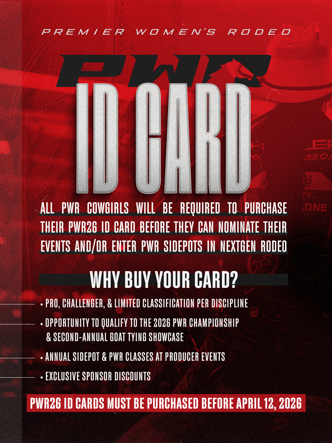 Want to compete at Premier Women’s Rodeo? Start by purchasing a $150 PWR ID Card, which offers benefits like Classification for each discipline, exclusive cash bonuses at WRC events, and eligibility for the Premier Women’s Rodeo. Buy your card today in NextGen Rodeo App.